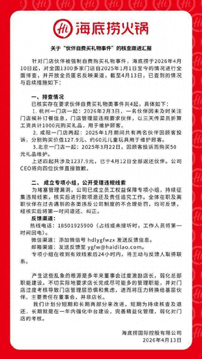 针对门店伙伴被强制自费购买礼物事件,海底捞于2026年4月10日起,对全国1300多家门店自2025年1月1日至今的情况进行全面排查,并开放全员匿名反映渠道,截至4月13日,已查到的情况与后续措施如下: