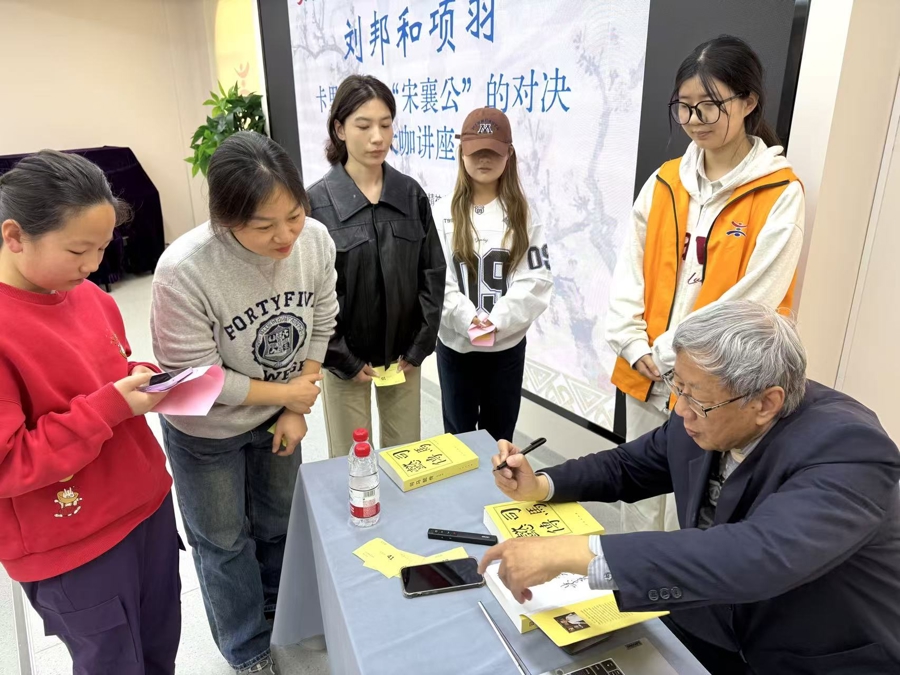 讲座中,朱子彦教授抛开影视戏说与荧屏滤镜,立足真实史料展开解读。他讲道,西楚霸王项羽不仅是荧幕上的英雄形象,更是一位重颜面、带着先秦贵族气质的复杂个体;而刘邦则兼具狮子和狐狸的“习性”,有着独特的“卡里斯玛”人格特征。教授用生动的典故梳理了楚汉争霸的历史风云,台下观众频频拿起手机记录,生怕错过关键内容。现场听众既有周边社区的居民,也有专程赶来的高校学生听讲团,有学生表示,这场讲座让遥远的历史人物变得触手可及,一对母女听完讲座后还幸运抽得教授签名著作,孩子更是迫不及待追问下一场讲座的时间。